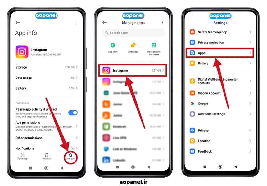 برای انجام این کار، به تنظیمات گوشی خود بروید، وارد بخش برنامهها (Apps) شوید، اینستاگرام را پیدا کنید و سپس گزینه Clear Cache را انتخاب کنید. پس از انجام این مرحله، مجدداً برنامه را باز کرده و بررسی کنید که مشکل برطرف شده است یا خیر.