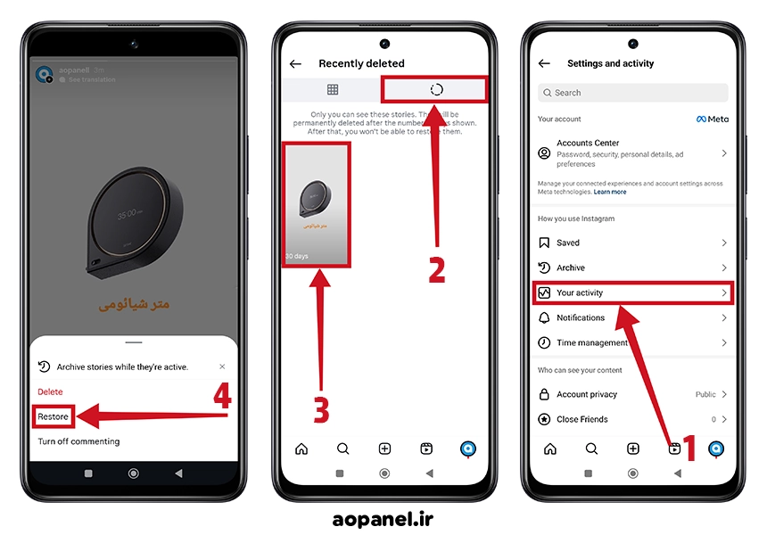 اگر قصد برگرداندن پست پاک شده اینستاگرام را دارید، کافی است اول وارد بخش Settings شوید سپس به بخش Account بروید و وارد بخش Recently Deleted شوید و همان جا گزینه Restore را بزنید تا بازیابی پست های حذف شده انجام شود.