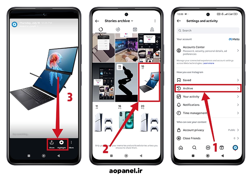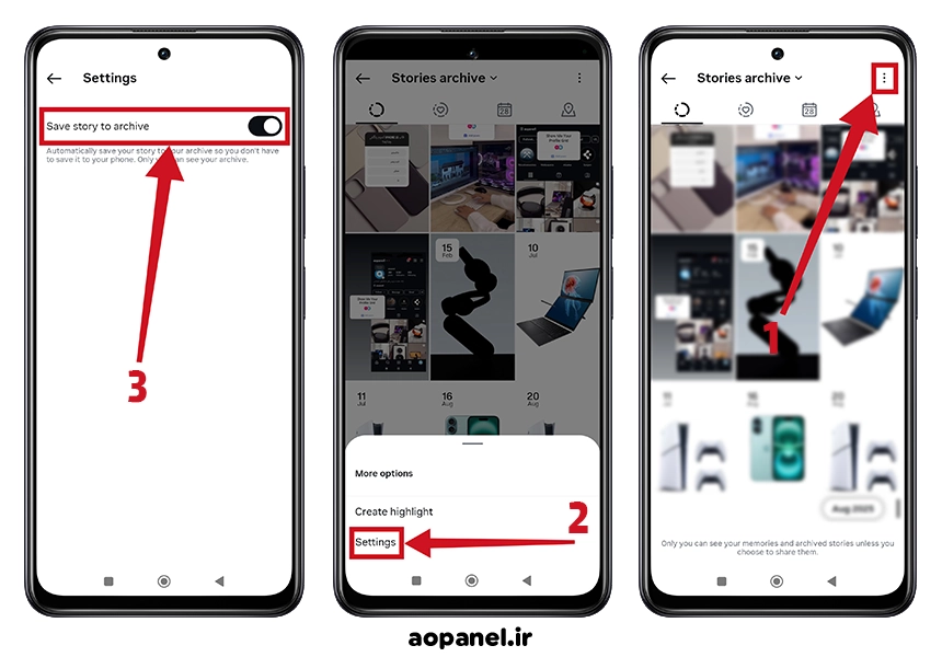 در تنظیمات اینستاگرام، بخش Archive را فعال کنید تا همه استوری ها به صورت خودکار ذخیره شوند و حتی در صورت حذف، نسخه آرشیو شده باقی بماند.